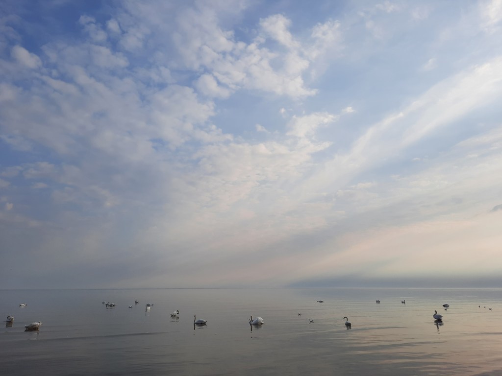 Sea is calm and light blue. Horizon line glows white. More than thirty swans glide close to shore and feed on algae. Black headed gulls talk and talk, and talk. Strong smell of seaweed lingers in the air. The breakfast table is set. A chain on my bike nearly falls off but I manage to get it in place and throw my bike in sand. I kneel and feel with my bare knees how cool the beach sand is. I look at the light blue everything. Swans so white in the quiet morning sun. It has to be a dream. Before I leave, I look for the one last time. The sea has turned darker blue, the sky has a tint of purple and the horizon line glows electric blue. It is impossible to photograph it. Just like you can’t take a photo with you from a dream. No one will believe me. I will try to never forget.