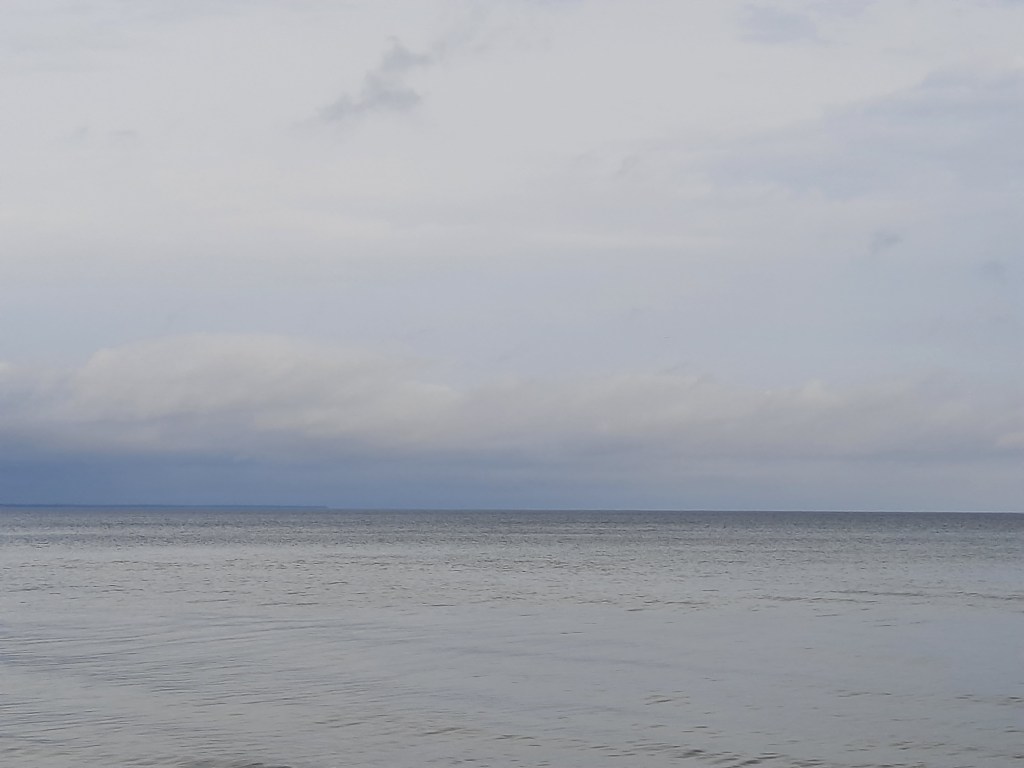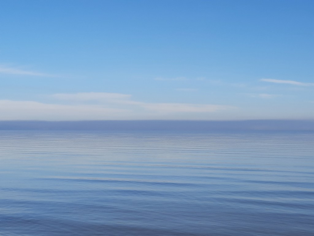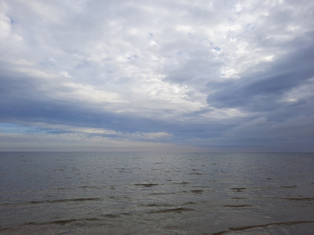 A thick fog all around our house when I wake up. Until I get dressed and cycle to the seaside, the fog has gone. I feel as if I have missed the show by arriving too late. But you can’t be too late for the sea. She is all pearly, the sky is light blue with a purple cloud like a distant mountain or some magical island rising above the horizon. Gulls are having a chat on the water, so many bird sounds coming from the sea. Closer to the shore and from far away too. What are those ducks? Making a constant noise. A swan flies close to the water surface moving its wings loudly as a boeing. Crows wander the beach with arms crossed behind their backs, always suspicious of me. Sun warms my face. Runners run, dogs bark. I feel grounded here. Sand is dotted after last night’s rain. A line of foam moves on the shoreline like a snake of bubbles. The long line my tires leave in the wet sand looks like a snake too. In the dream last night there was a wall built on my road. I couldn’t get to the sea. What a nightmare. When I return home, the fog returns.