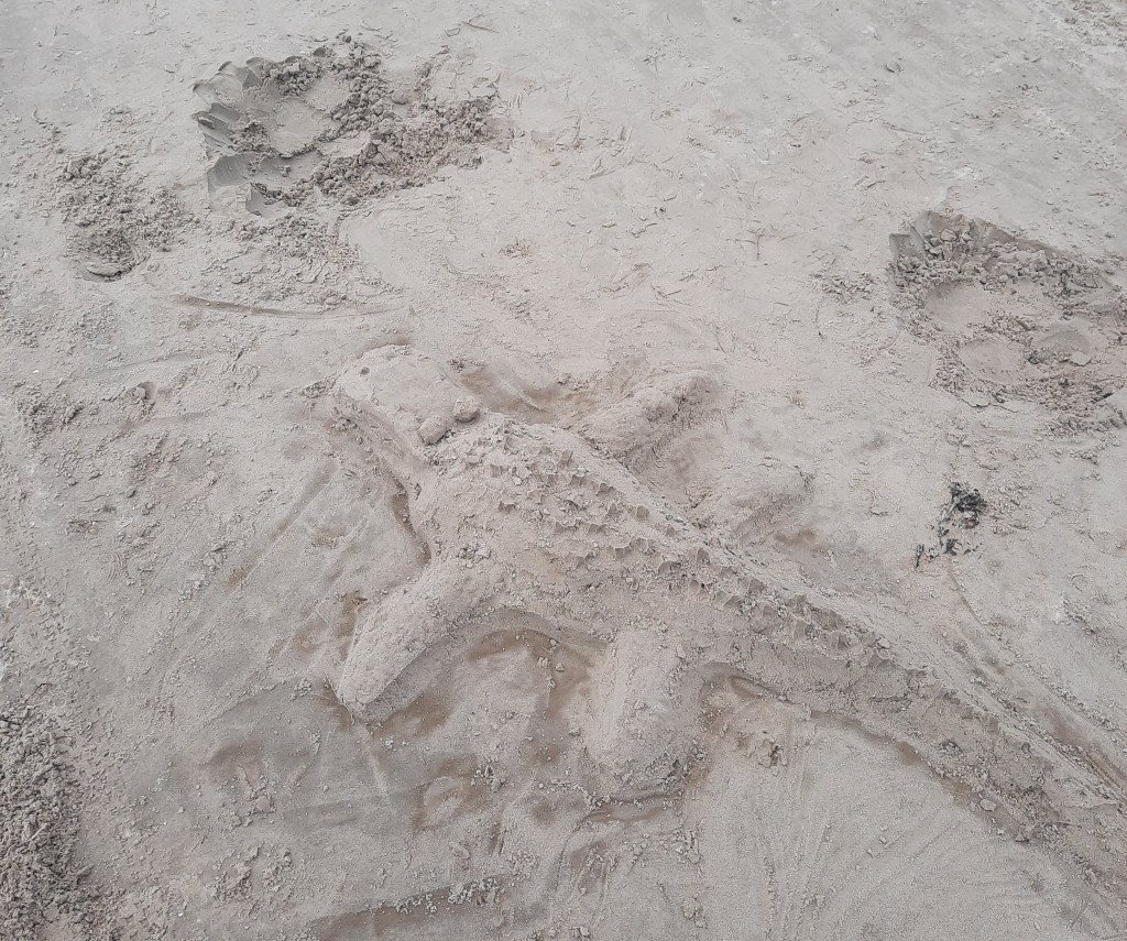 Sea seems more immense. Her skin is crumpled, in a constant movement. Eight swans still here. They bob on the water like catamarans. In the distance six ducks look entirely black. But are they really? Sea is grey, sky is lilac, pink, ash and a patch of light blue where the clouds have parted. Sand is so beautiful today after a windy yesterday: wavelike lines crossed by bird prints. I sit down at the beach. Feels like calm before the storm. A crocodile built from sand on the damp shoreline gazes out to sea together with me. The weather is changing. On my ride back I peek the flowerbeds of strangers over the fences. Sun-bleached photos of lost cats are glued to electric poles and don’t reveal the whole story. It starts to drizzle when I arrive home. I pour sand out of my sneakers. I’ve taken a bit of beach with me.