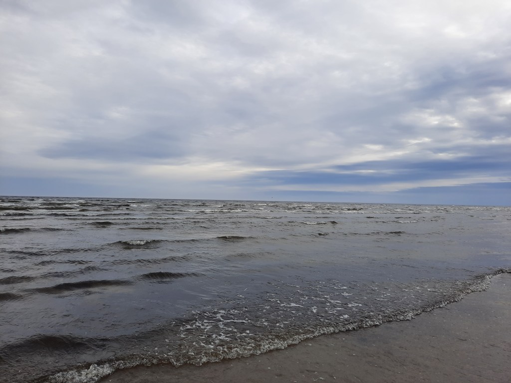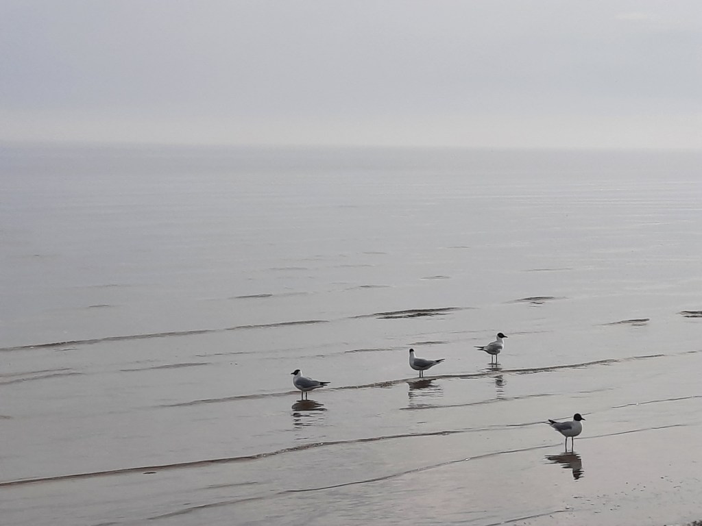 So that’s how you look today. No wind in my wet garden but here the sea all choppy. A slight drizzle dots my notebook and the beach sand, too. It had been raining all night which didn’t stop the nightingale to put up an unforgettable premier of the season in our black apple garden. No swans on the sea today. It’s time for the herring gulls (or silver gulls in Latvian) to drift on the wings of storm. But where are the swans I wonder? Until three long necks fly across the sea, across the beach as low as if I could touch their bellies if I would jump a little bit higher and over the pine tips away. Sky is clouded blue, sea is silver and grey and green throwing whitecaps at me. Crows keep guarding the beach while gulls – they own the sea.
