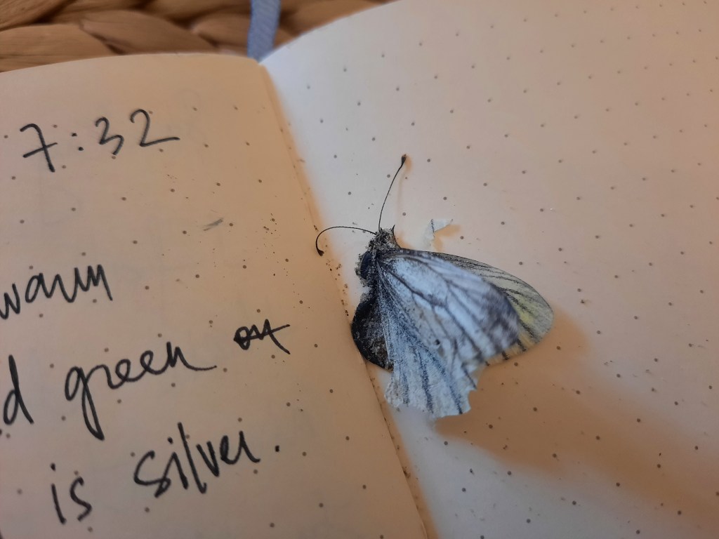 Puddles are continents on a rain map of pavement. Pine pollen highlights their borders pale green. Beach is deserted. I find a dead butterfly among the seaweed. Both antennas intact, wet wings in the colour of puddle pollen. I gently put it inside my pocket. I somehow can’t just leave it here. Dust from its wings print my fingers, I could smear it on my eyelids like silvery shades. But my eyes search for birds. Yesterday I tried to clarify what species of ducks were gathering in the distance. I have to see them closer. A pair flies close enough to notice their white plumage, black wingtips and black head. Soon one duck flies so near my face as if it would want to be recognised correctly. Brown feathers around its neck, I document in my notebook. It could be a shelduck. After a swim in a silver sea I pick up a seaweed, called an Irish moss, spread it on my towel at the back of my bike and carry it home like a passenger.