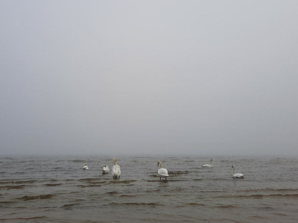 The sea has nearly gone. Swans bob in the thick fog like ghosts of kings and queens. Dogs with their owners appear from nothingness on the left and disappear into nothingness on the right. Sea is louder than yesterday. What will she be like tomorrow? Or the moment I’m gone? I slip on a seaweed carpet before going in. Waves keep coming and coming towards the shore like there’s more where they come from. Swans hide their faces into the sea. I do the same. The fog is cold. My fingers freeze writing this down. Gulls offer phrases to be added: creek, creek, creek, creek. Mute swans remain mute, writing poetry with their movements alone in the sea.