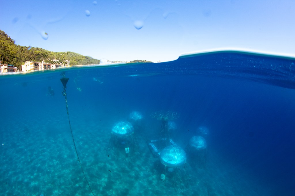 Nemo dārzu veido seši ar gaisu pildīti plastmasas kupoli, noenkuroti jūras dzelmē ar ķēdēm un skrūvēm netālu no Noli pilsētas krasta Itālijā. Foto: Ocean Reef Group. Nemo’s Garden By OCEAN REEF.