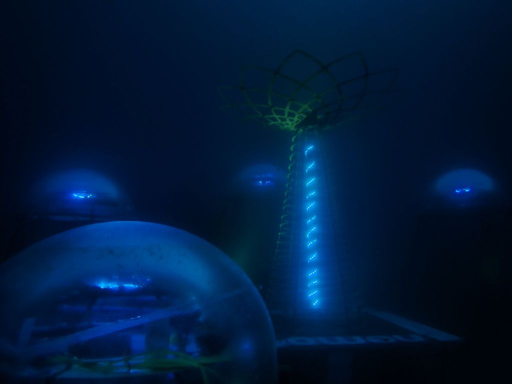 It is fun to see crabs and other sea life moving around the shelves where crops are growing. One day, while staying in the biosphere I felt the night coming. Suddenly it all went dark. But turned out that a giant school of anchovies was surrounding the biosphere and thus hiding the sunlight. It was impressive.