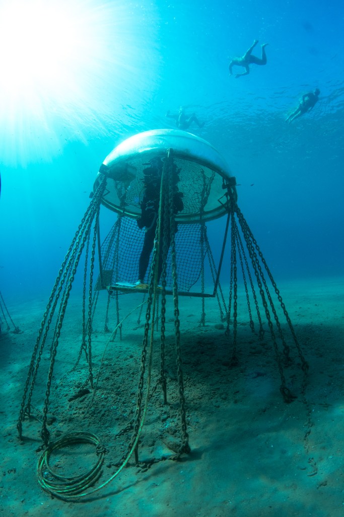 Nemo’s Garden is composed of 6 air-filled clear plastic pods, anchored to the bottom of the sea by chains and screws, just off the coast of Noli, Italy. Photo by Ocean Reef Group. Nemo’s Garden By OCEAN REEF.