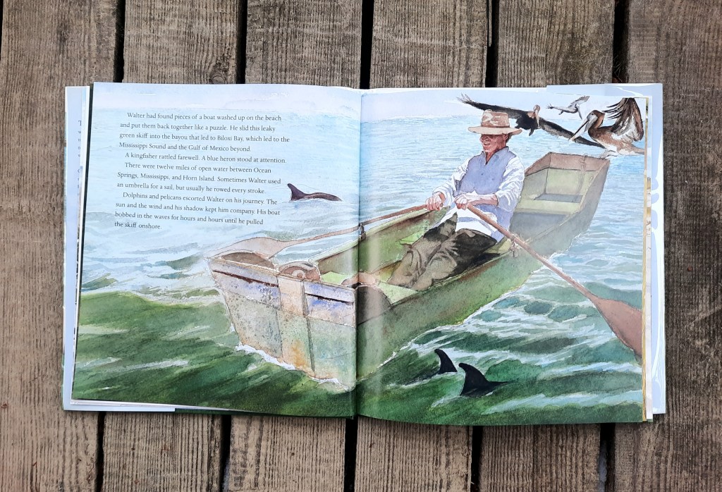 “There were twelve miles of open water between Ocean Springs, Mississippi, and Horn Island. Sometimes Walter used an umbrella for a sail, but usually he rowed every stroke. Dolphins and pelicans escorted Walter on his journey.”