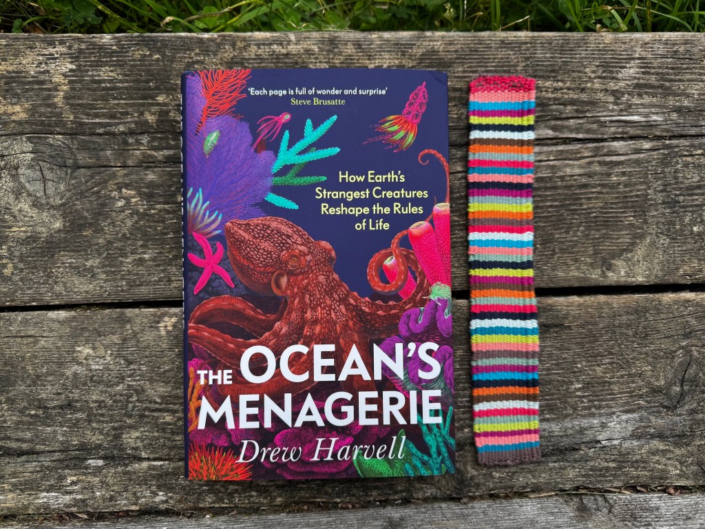 This particular bookmark is inspired by the dazzling cover of The Ocean’s Menagerie by Drew Harvell. Every vivid hue from the book’s underwater world finds its way into the stripes – coral red, anemone pink, jellyfish orange, bioluminescent teal, and deep-sea purples. It’s a celebration of Earth’s strangest and most wondrous creatures, woven into rhythm and color. Not just a bookmark, but a current – pulling the marvels of the ocean into the reader’s hands.