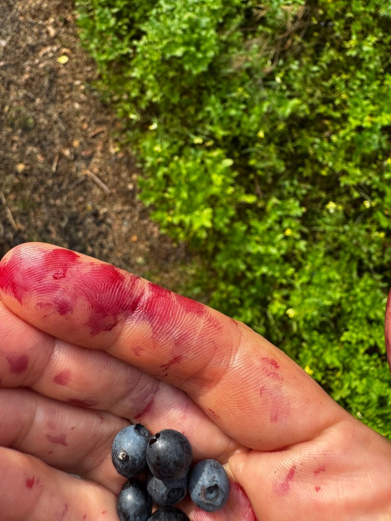 The forest is full of blueberries, getting bigger every day, and my fingers turned purple from eating them straight from the bushes, like soaked in a forest ink.
