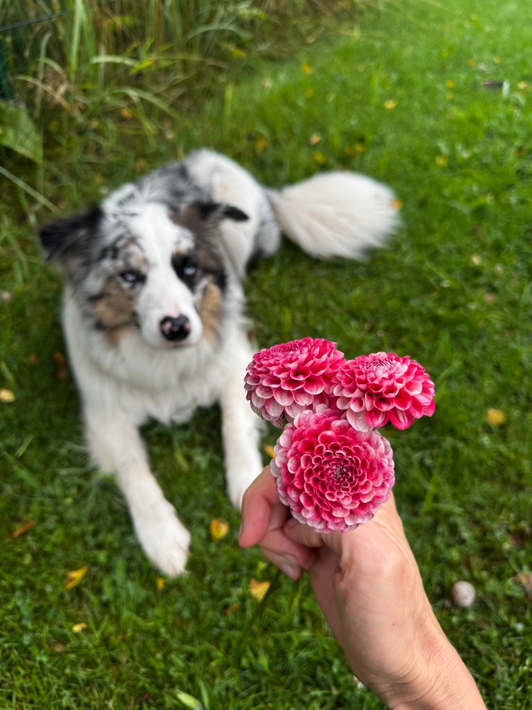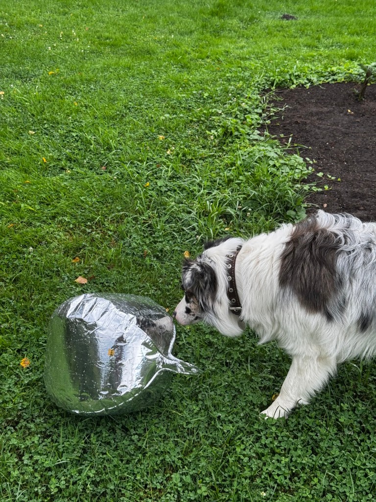 Yesterday morning, on our daily very early walk with a coffee cup and stick, Nemo and I discovered a big silver balloon stuck among the dahlias. I took it as a good omen – at least it will not hurt any bird or animal anymore. Nemo sniffed it and licked it, just to be sure.
